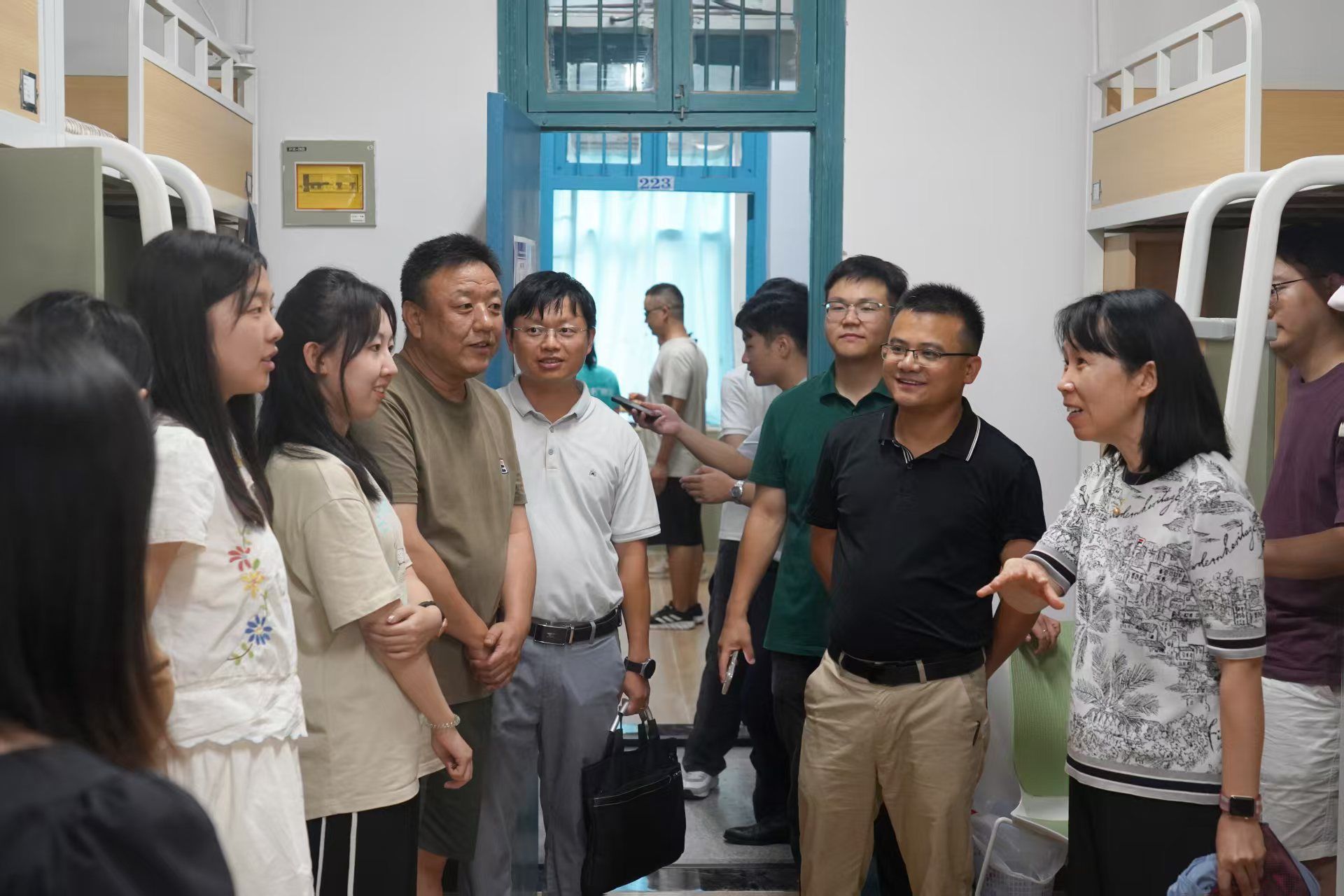 会后,院领导、系主任、班主任和辅导员一行走访了本科生宿舍,与新生和家长进行了深入交流,详细了解学生的思想动态与实际需求,叮嘱同学们尽快适应大学生活,调整好学习状态,做好时间规划,注意身心健康,营造积极向上的宿舍氛围。