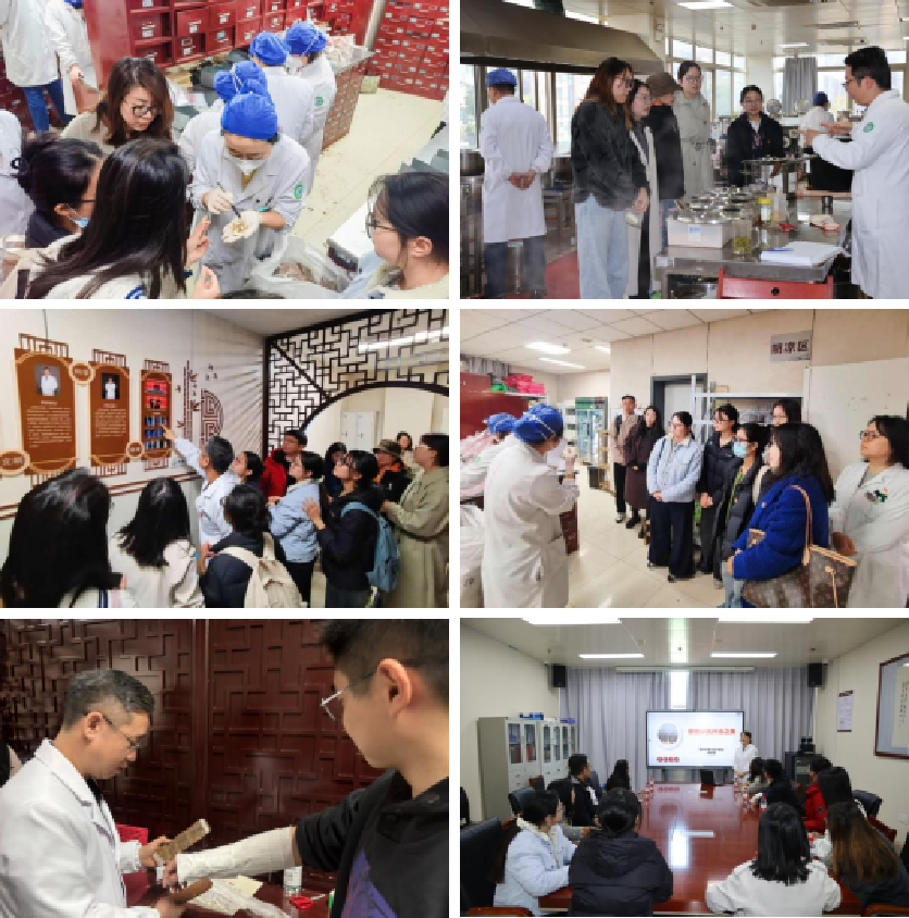 在杜则玲的带领下,中药研究生支部的党员们参观了医院部分科室,增进了对专业知识的认识。在中药房,同学们学习了解药房各分区构造功能鉴别了秋冬季节使用频率较高的补益类中药饮片,如黄芪、甘草、党参等,与药房中药师现场讨论大宗药材的道地性同时,体验了使用传统称量工具进行抓药配方煎服室,同学们了解到医院代煎汤剂的全流程,并与中药师共同探讨汤剂煎煮使用器皿及煎煮工艺流程可优化项等学理问题骨伤正骨室,科主任带领同学们沉浸式体验了传统中医如何治疗骨伤,并与西医治疗做协同对比,同时带领同学们学习日常护颈椎小技巧;皮肤科,同学们认真听取了专家医师关于“火针以热引热”外治急症皮肤病的专题报告