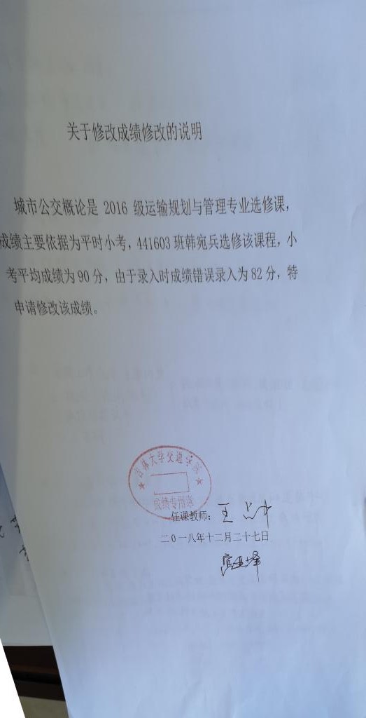 2016级韩宛兵同学(学号:44160308)2017-2018-2学期课程成绩更正如下: