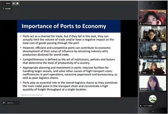Raymond教授此次专题讲座的主题是《Transport Infrastructure and Operations in a Port Economy》。讲座从港口规划设计、港口交通需求预测、港口腹地可达性三个方面出发,分享了海运行业的背景、发展、机遇与挑战。为加深对此次专题讲座的专业性理解,Raymond教授通过对新加坡Tuas超级港、Pasir Panjang集装箱码头以及德国汉堡港、威廉港的案例分析,深入浅出地介绍了各种预测方法和基础设施的应用场景,分析了港口建设对于腹地经济的影响作用。理论与实践的结合激发了全体项目学员的专业兴趣,令师生们在海洋运输与交通基础设施建设等相关领域有了进一步的认识和思考。在交流讨论环节,Raymond教授与师生们就港口建设、低碳运输以及疫情影响下的海运贸易等问题进行了深入交流。交通六合彩网
