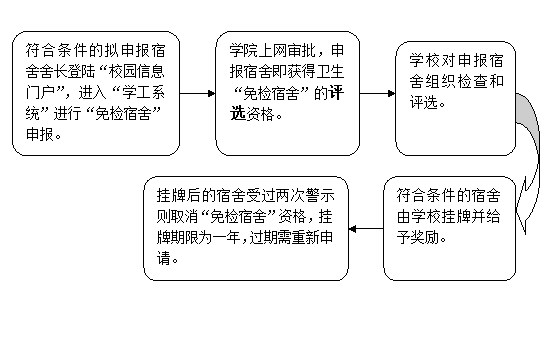 2、卫生“免检宿舍”挂牌后,如出现不符合标准的情况,将给予警示,受到两次警示的宿舍将取消卫生“免检宿舍”资格。