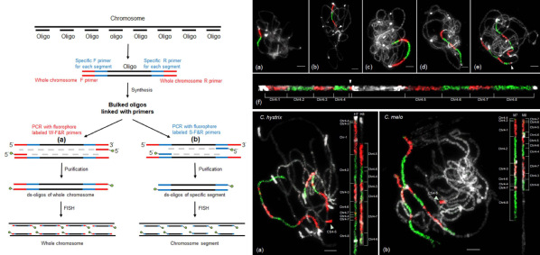 近年,随着测序技术和DNA合成技术的发展,基于寡核苷酸探针(oligos)的染色体涂染技术走上舞台,然而,oligos文库的标记合成是一个相对复杂和耗时耗费的工作。基于此,该研究通过生物信息学方法筛选获得特定染色体(或染色体区段)的oligos集,巧妙地在每个oligo的两翼加上特异的引物接头,通过序列合成获得oligos文库,再利用特定的荧光标记引物进行多重PCR扩增,灵活简便地获得特定染色体或区段的探针,实现全染色体或染色体区段涂染。利用该方法,该论文将染色体特定的oligo探针用于甜瓜属植物黄瓜、甜瓜和酸黄瓜三个物种的染色体分析,直观地揭示了三个物种的染色体进化重排特征。