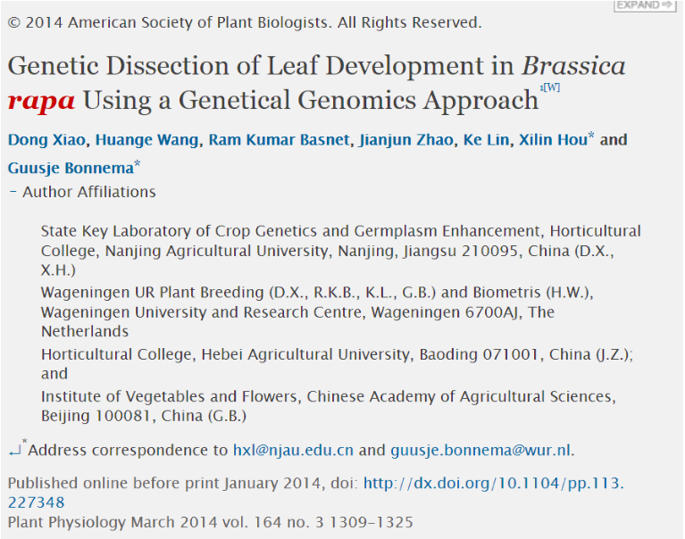 白菜系统生物学实验室与荷兰瓦赫宁根大学(Wageningen University)植物育种系合作完成的研究论文"Genetic dissection of leaf development in Brassica rapa using a genetical genomics approach"在《Plant Physiology》上发表,影响因子为6.555。肖栋博士为第一作者,侯喜林教授与Guusje Bonnema教授为共同通讯作者,六合彩网