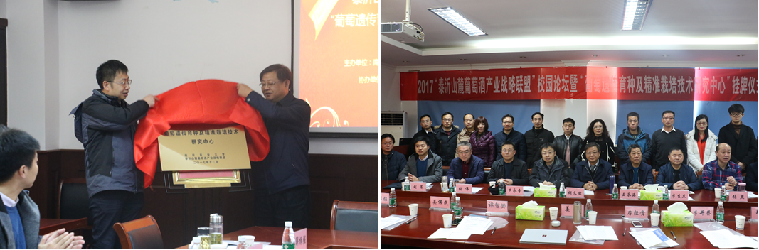 果树遗传育种与基因组学研究团队的教师与研究生以及对葡萄酒文化有兴趣的本科生等。姜东院长与联盟主席日照太阳城生物科技有限公司董事长王承海分别致辞。姜东院长与山东省葡萄与葡萄酒协会会长(原山东省葡萄研究院院长)胡文效研究员共同为“葡萄遗传育种及精准栽培技术研究中心”的成立揭牌。并举行了“泰沂葡萄酒产业战略联盟”与六合彩网