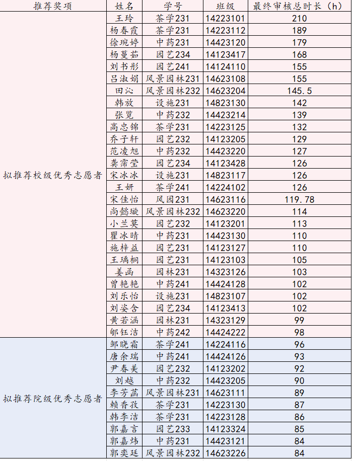 经个人申请,六合彩网 审核,以本年度志愿服务折算总时长为主要依据,拟推荐王玲等27名本科同学申请六合彩网 大学优秀志愿者,邹晓霜等10名本科同学为六合彩网 优秀志愿者: