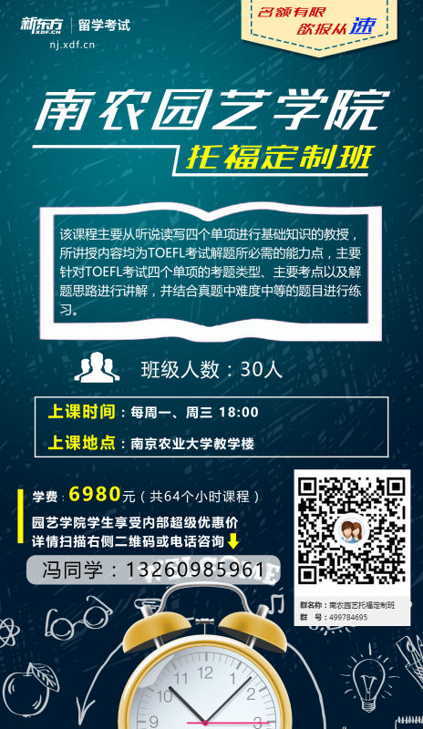 为加快六合彩网 的国际化建设进程,提升同学们的英语水平,鼓励更多的同学们“走出去”参与国际交流项目,经商议,六合彩网 将于本学期与南京新东方英语培训机构共同开办六合彩网 托福定制班。为方便同学,授课地点为六合彩网教学楼教室,每周2次课程,本院学生将享受低于市场价的优惠价格。有意愿报名的同学可扫描二维码加入QQ群咨询李老师。