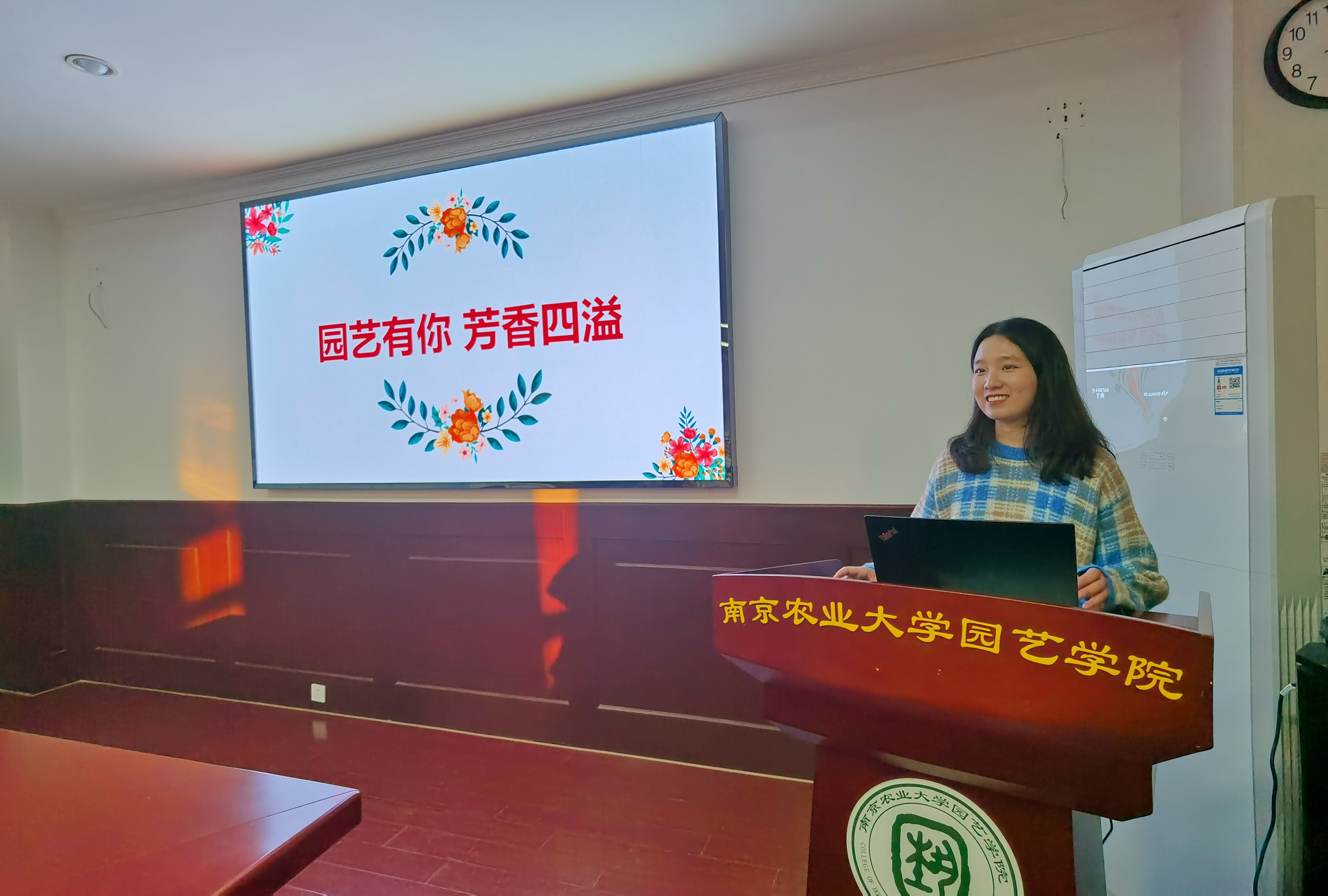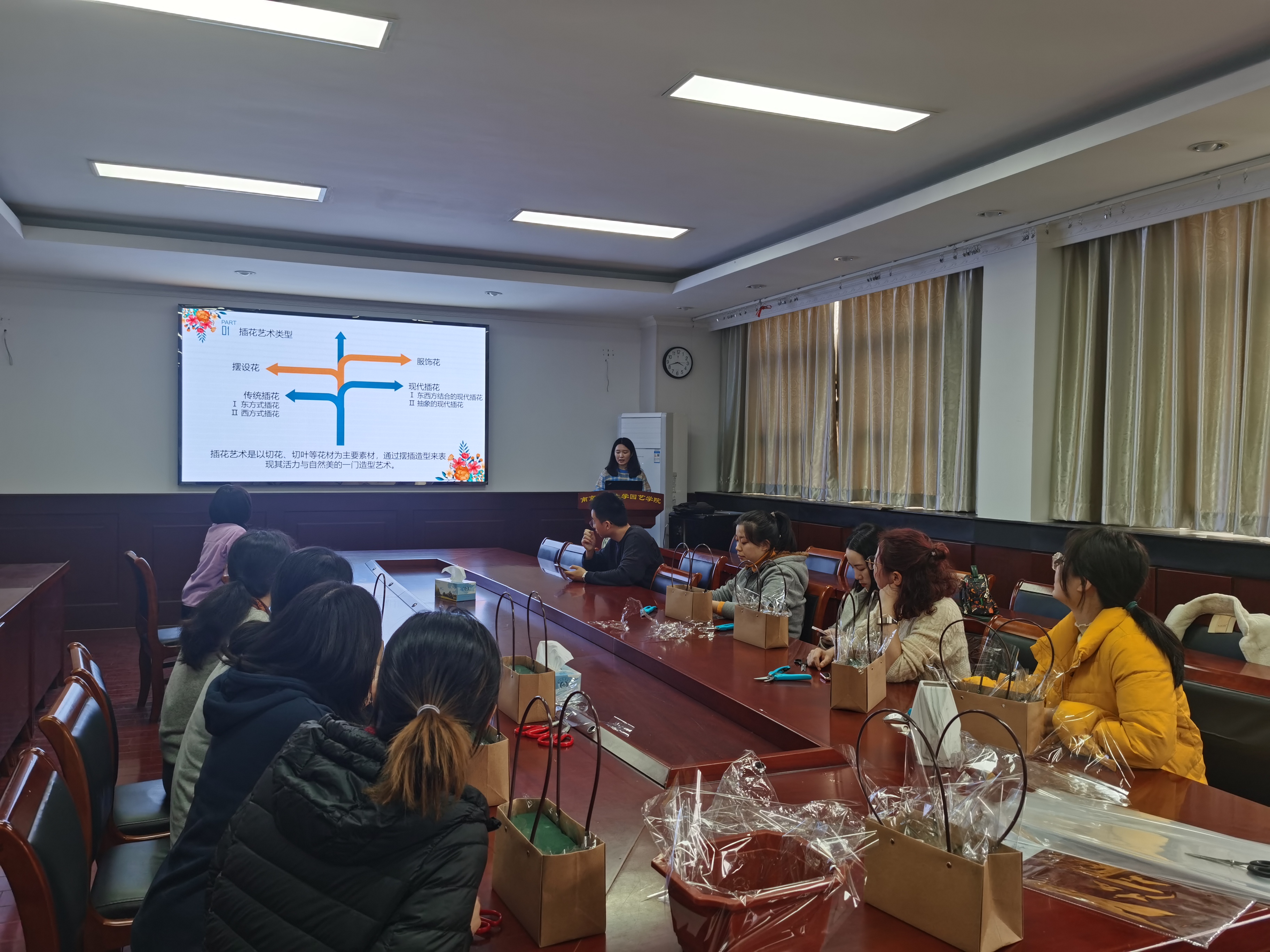 菊花课题组花艺经验丰富的孙炜博士作为讲授花艺师,她从插花的构思理念、色彩搭配、层次叠加、修剪技巧等方面做了详细讲解和现场示范,带领大家在插花艺术中发现美、创造美、传递美。
