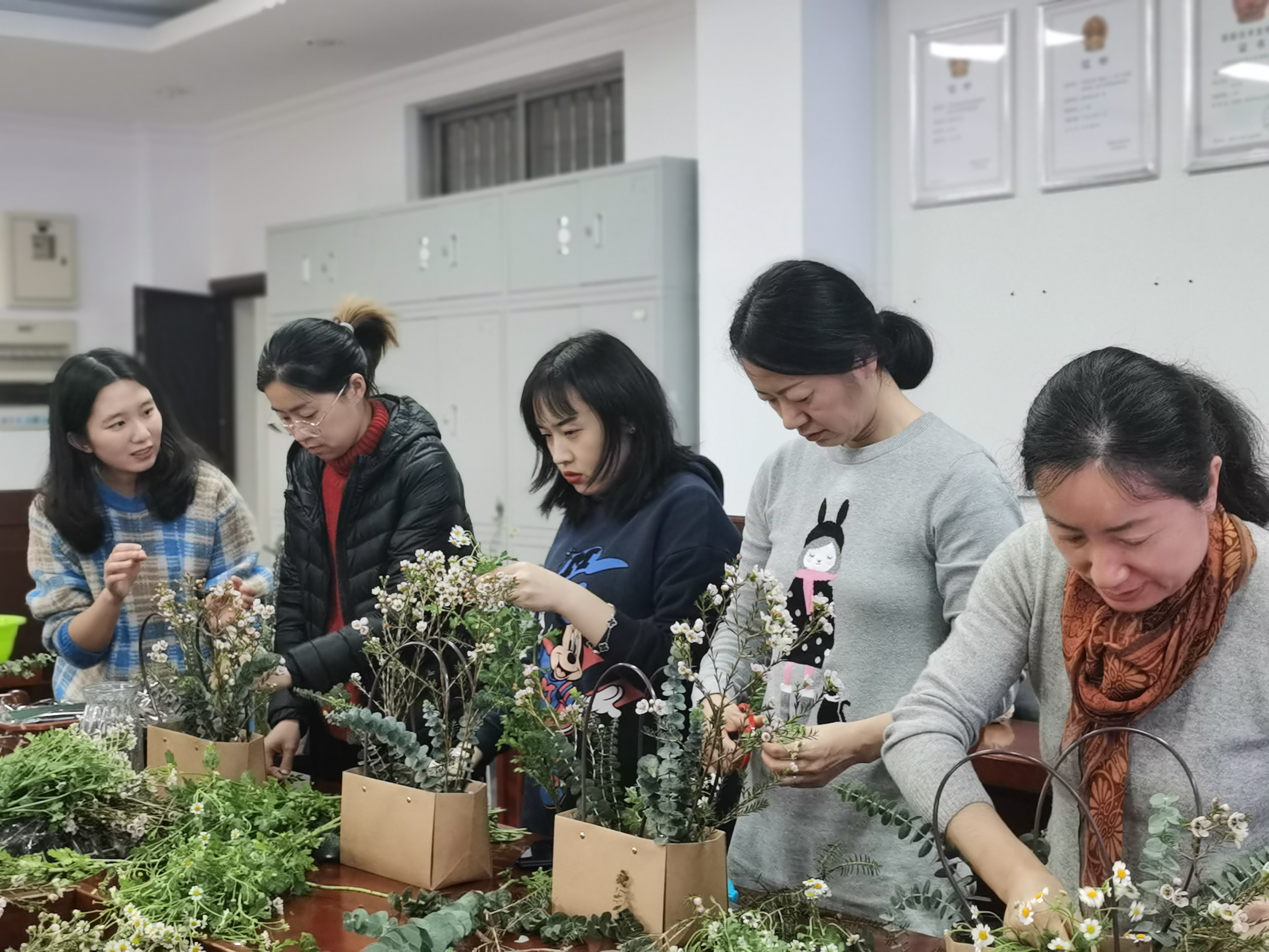 现场芳香四溢,气氛温馨。在花艺师的指导下,大家兴致盎然,构思造型,妙手扦插,挥剪修裁,一个个细致精美、别出心裁的插花作品逐渐完工,普通的花叶、枝条,经过心灵手巧的修饰与加工,变成了令人赏心悦目的艺术品,娇艳的花朵辉映着老师们灿烂的笑容,淡雅的花香衬托出老师们优雅的气质,大家互相分享交流,纷纷合影留恋。