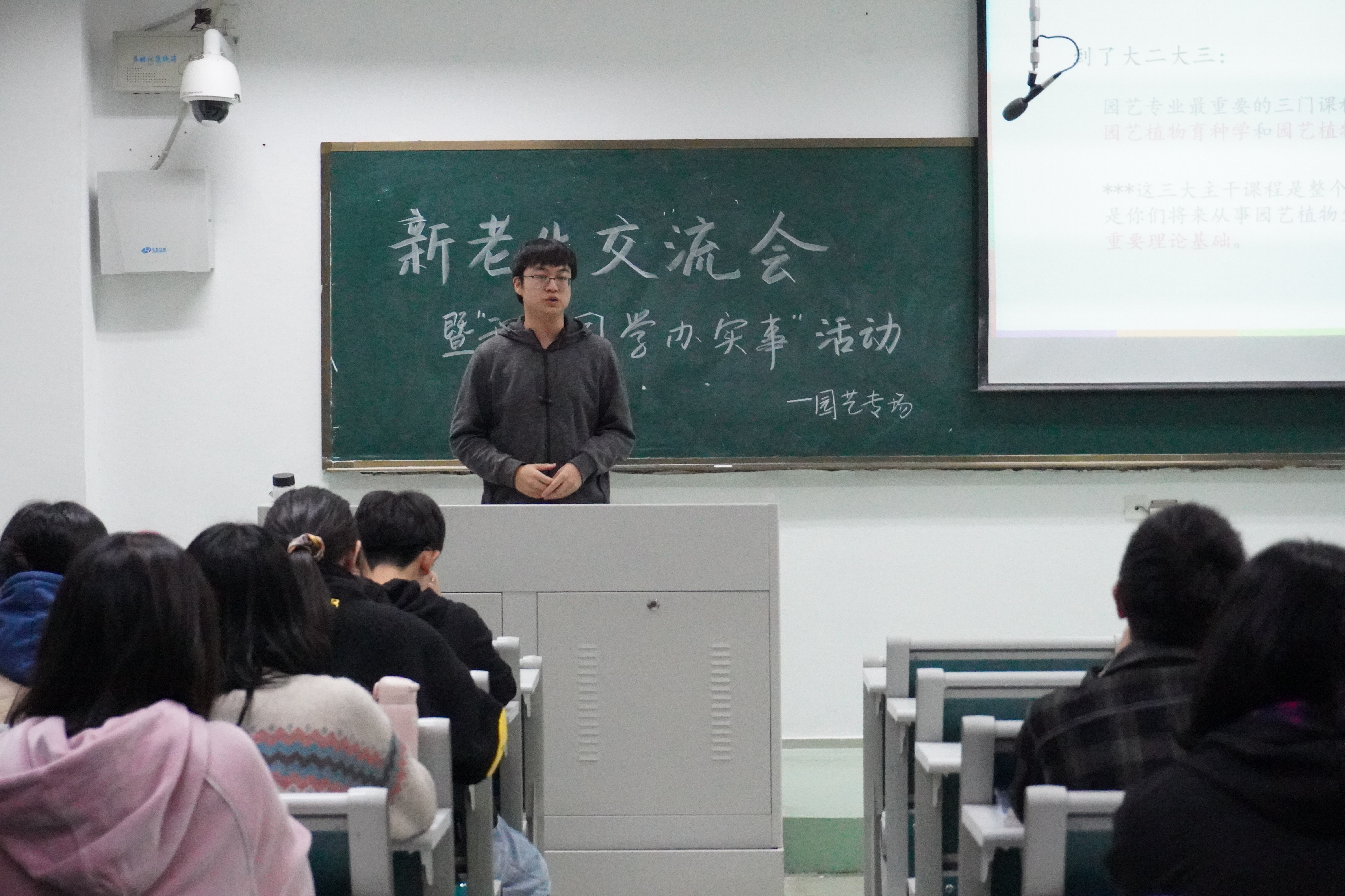 之后赵瑜涵同学和大家分享了自己大学的生活,大学生存指南以及保研的经验和入党收获。首先,赵瑜涵同学为大家展现了自己充实而精彩的大学生活,希望以此激励同学们勤勉致知并有所收获。随后,赵瑜涵结合自身心得分享了大学的几条生存指南,如重视学习、多参加活动、保持身体健康、及时规划总结和提高效率,希望帮助同学们尽快适应大学生活。之后,赵瑜涵同学详细介绍了保研的流程以及园艺专业学生党支部和入党的收获。最后,她以自己大一入学新生讲座上拍的一张“大学遗憾排行榜”做总结:认真走过的路都不会有遗憾,希望大家都拥有一个丰富精彩的大学四年。
