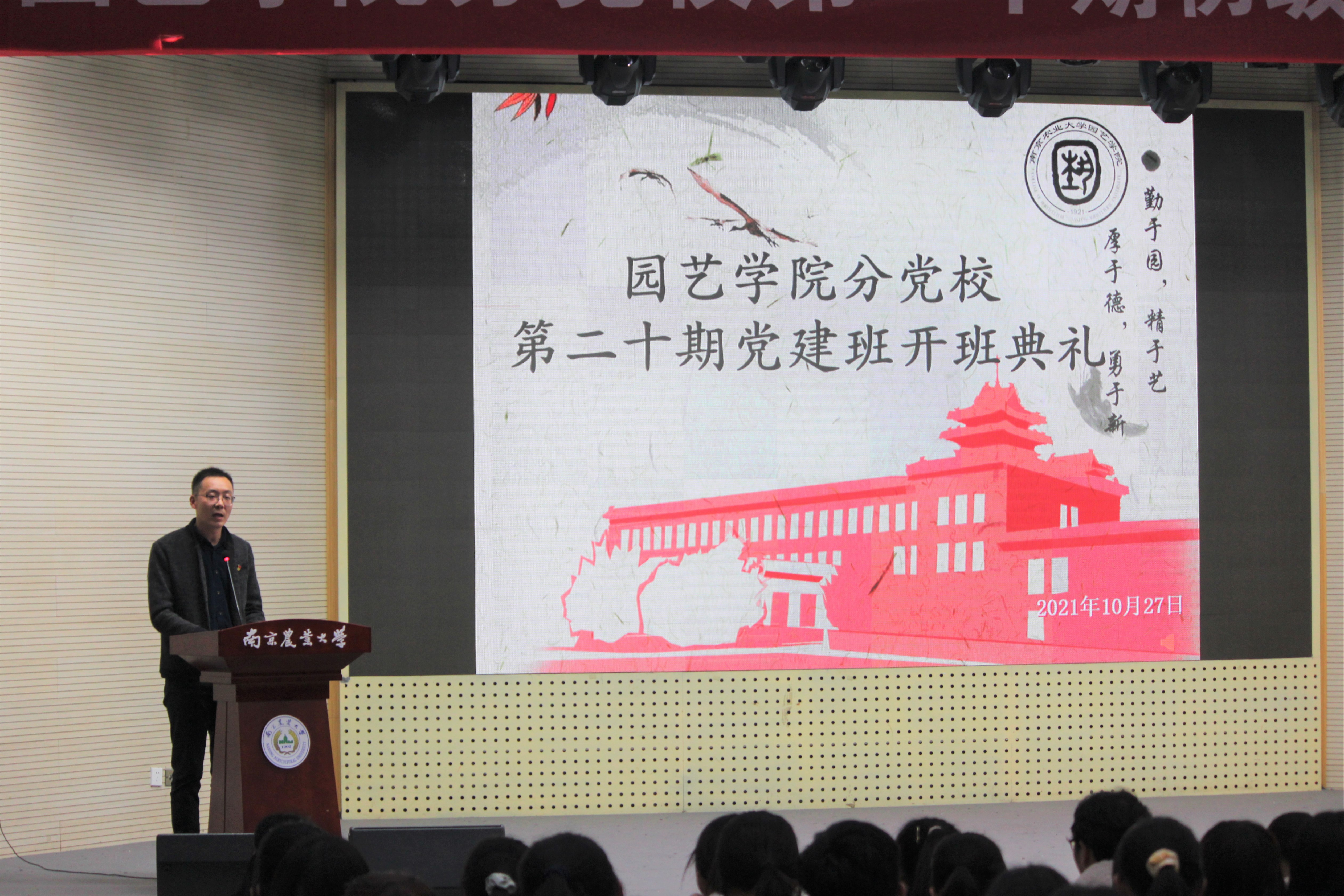 新生代表发言过后,文习成寄语参会的初级党建班学员。他以党的建立和发展为引,说明正是有了党和国家拧成一股绳,才能使中国从弱小到现今的强大。他要求和勉励大家,一是要思考为什么入党。希望大家不断端正入党动机,从党史中寻找答案,也可以从电视剧《觉醒年代》和电影《长津湖》等影视作品中感受战火纷飞的年代青年的奋斗牺牲精神。二是要思考入党的要求有没有达到,希望大家从党章中寻找答案。三是要明确入党做什么,希望大家勇担青年人的使命和担当。最后,文书记希望广大园艺学子能静下心来去学习、敞开心扉谈想法、迈开步子去实践,在国家需要的时候勇于站出来,做学习上的佼佼者、工作上的奉献者、思想上的先行者,把握好机会,好好思考,无愧于自己、家庭、人民和时代。