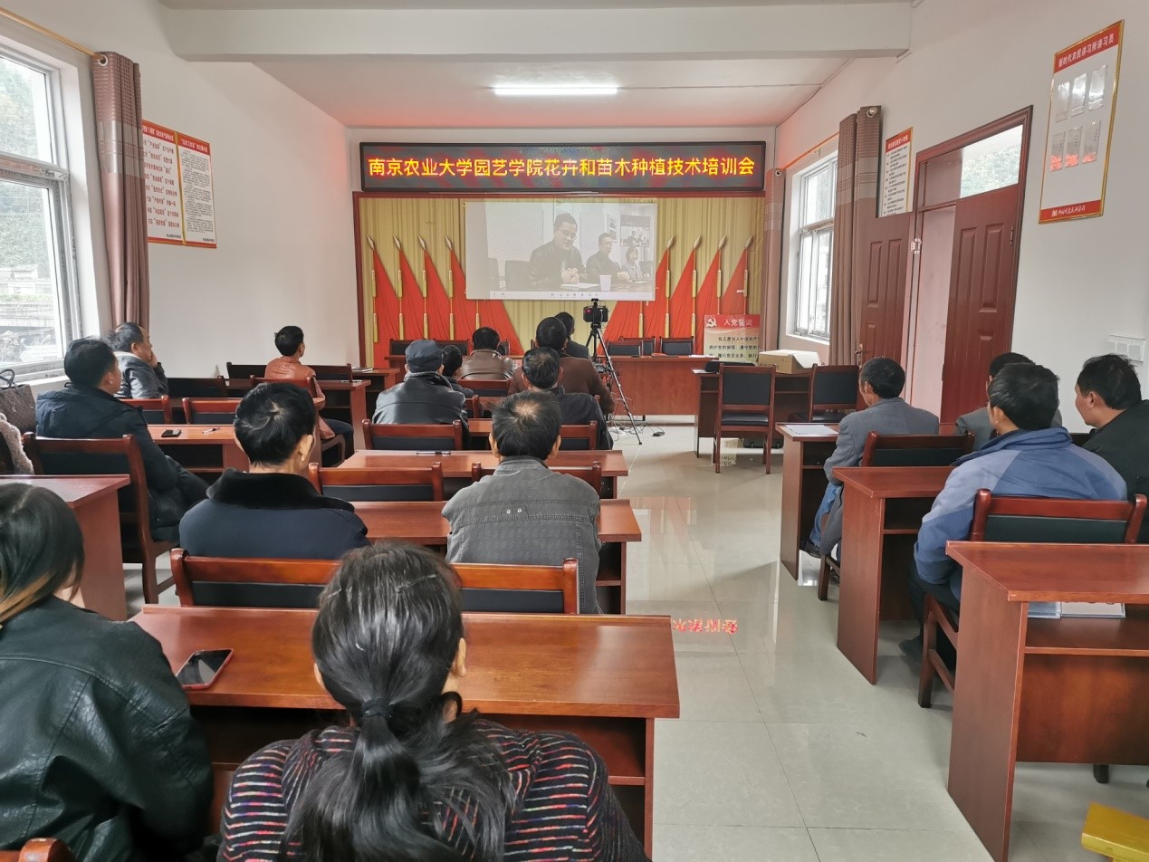 与谷羊村委进行了交流,征集了谷羊村在产业发展过程中遇到的困难和瓶颈。针对谷羊村发展“红花檵木”等绿化苗木过程中遇到的问题,管志勇教授做了题为“苗木培育关键技术”的专题培训。他从红花檵木的品种特点、生活习性、繁殖栽培事项到育苗基质配比、施肥养护等方面进行系统的讲授。33名参加培训人员认真聆听了学习技术讲座。