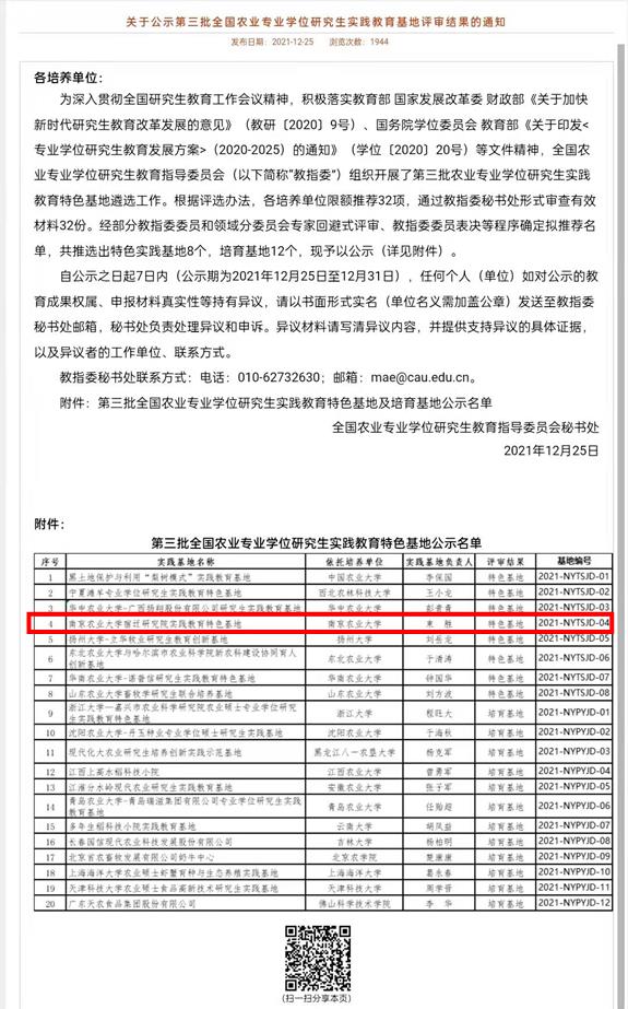近日,全国农业专业学位研究生教育指导委员会组织开展了第三批农业专业学位研究生实践教育特色基地遴选工作。经教指委委员和领域分委员会专家评审、教指委委员表决等程序,共推选出实践教育特色基地8个,培育基地12个,南农大六合彩网