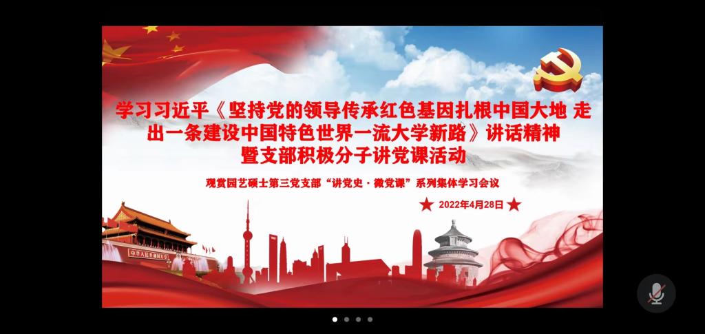 观赏园艺硕士第三党支部于生科楼B4011会议室及腾讯会议室线上线下结合举办深入学习贯彻习近平总书记在中国人民大学考察《坚持党的领导传承红色基因扎根中国大地 走出一条建设中国特色世界一流大学新路》讲话精神暨支部积极分子讲党课活动。支部全体党员及积极分子参加本次会议,会议由支部副书记贾棣文主持。