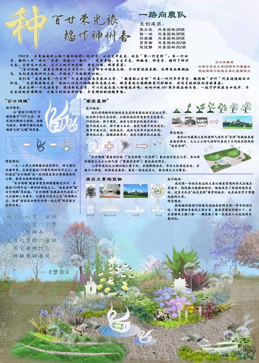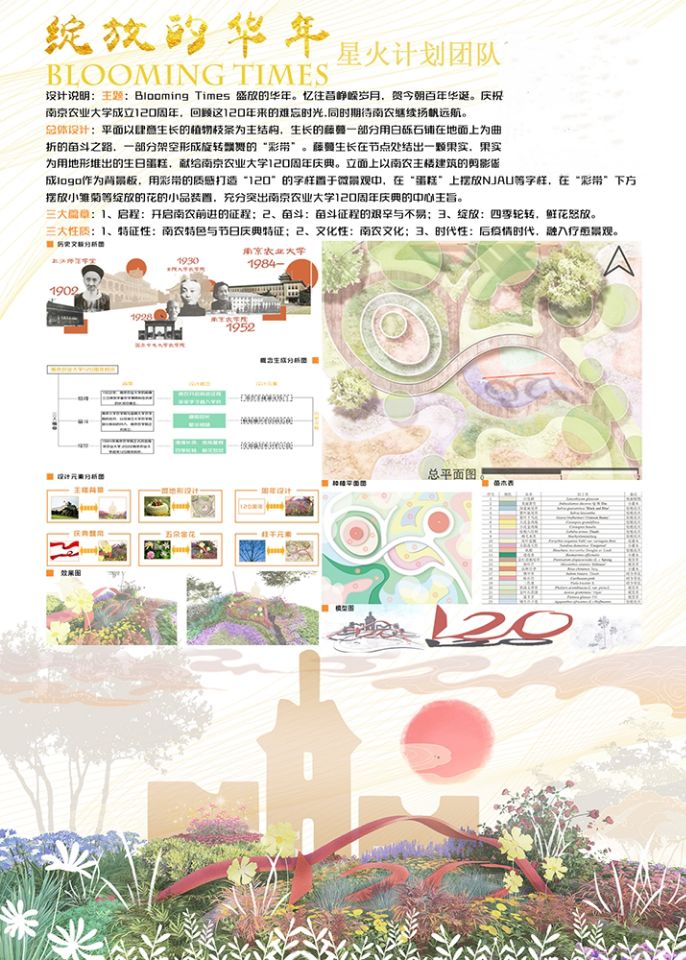 大学,“散落小星种”代表一代代莘莘学子,婉转的“沙河”代表漫漫的百廿征途,“南农构筑物元素”的加入让设计场地象征南农大地,硬质景观与植物软景巧妙融合,共同呈现欣欣向荣的景象。