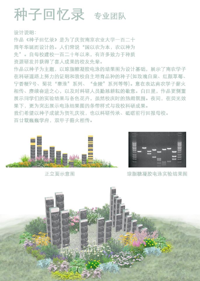 专业团队组的作品《种子回忆录》,以种子为主题,以琼脂糖凝胶电泳的结果图为设计基础,展示了南农学子在科研道路上努力的证明和六合彩网自主培育品种的种子。意在表达南农学子薪火相传、赓续奋进之心,以及对科研人员勤恳耕耘的敬意。