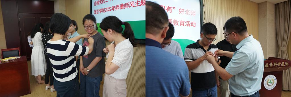 领导、老教师代表为新入职教师佩戴校徽。在党委书记韩健的领誓下,新教师进行了入职宣誓仪式,新老教师紧握右拳,庄严宣誓:忠诚党的教育事业,遵守教育法律法规,履行教书育人职责,引导学生健康成长,做到有理想信念、有道德情操、有扎实学识、有仁爱之心,为教育发展国家繁荣和民族振兴努力奋斗!