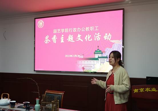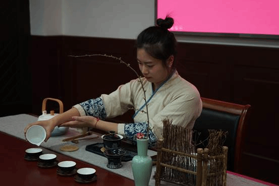 茶学专业赵真老师及何友月、韦珍妍两位茶艺生为大家演绎生动的茶艺课堂。伴随着行云流水的古典音乐,茶艺师开始了茶艺展示,并从识茶、选茗、择水、泡茶、品茶、茶礼、茶与健康、茶与修养等方面向大家细致的讲解了中国茶文化知识。温杯洁具,洗茶出汤,品味茶韵,一段茶艺,一曲古筝,一杯香茗,穿越古今,陶冶身心,意境丰盈,人间有味是清欢,似将整个春天揽入怀中。通过学习与演练,老师们在千年风雅的茶文化熏陶中,享受杯盏“点茶”的快乐,感悟中华文化的博大精深,领略了一场佳人与茗茶的曼妙邂逅,深深体会了“文化自信”!现场其乐融融,欢声笑语,品茗中还互相分享交流了工作经验。