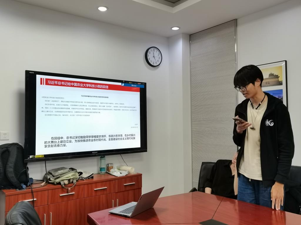 会上,支部成员还共同学习了习近平总书记给中国农业大学科技小院的回信精神,深切体会习近平总书记在信中对农科学子提出“厚植爱农情怀,练就兴农本领”的殷切希望,黄文韬、丁子辉、王敬涛等支部成员积极分享学习心得,提出自己对农业农村现代化的理解。其中黄文韬同志提到自己曾申请支教活动,期望将自己所学的知识带到乡村小学,让更多儿童了解乡村振兴、了解园艺,认识到园艺发展对中国现代化发展的重要意义;丁子辉同学则希望自己能够读书深造,深入研究农业知识与技术,为全面建设社会主义现代化国家贡献青春力量。