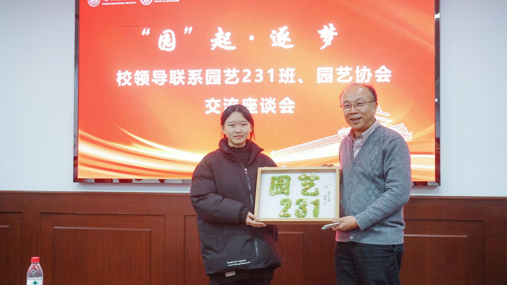 座谈会上,钱春桃及赵爽老师就园艺231班和园艺协会的情况做了简要介绍,相关学生负责人也就特色活动开展情况进行汇报,丁校长充分认可班级、协会的相关建设,并对未来发展给出了意见建议。活动的最后,班级和协会还向丁校长赠送了自己精心制作的礼物。