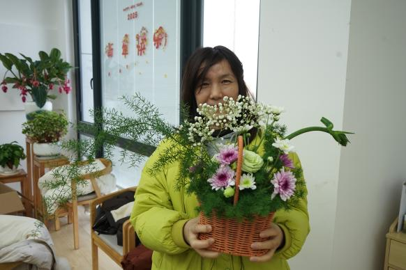 活动现场,各位老师根据自身喜好撷取花枝草木,在一方小容器中找到平衡,拼接出充满魅力的插花作品,活动室内欢笑不断,气氛热烈。