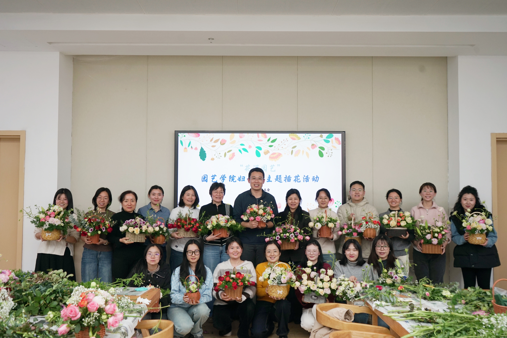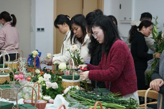 工会于滨江校区园艺楼167举办“花满园艺”——妇女节主题插花活动,院长陈素梅、院党委副书记石木舟及各学科教师参与。