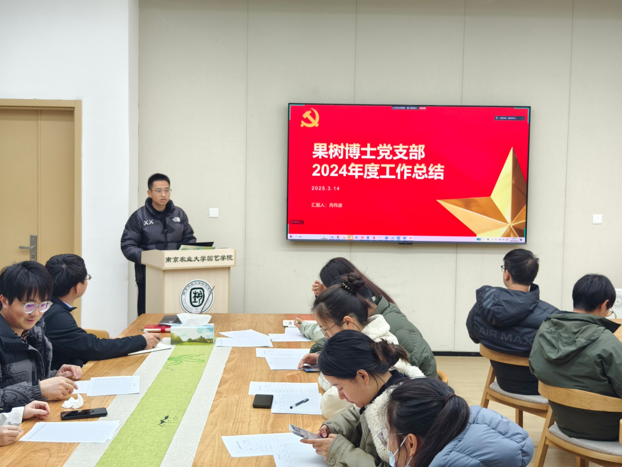 2025年3月14日,果树博士党支部在园艺楼167会议室召开2024年度组织生活会暨民主评议党员会议,党支部书记王鹏主持会议,支部全体党员参加。