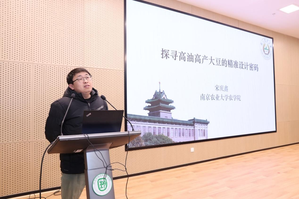 教授宋庆鑫以《探寻高油高产大豆的精准设计密码》为题,从基因组学与分子设计育种角度,分享了提升大豆品质与产量的创新思路。