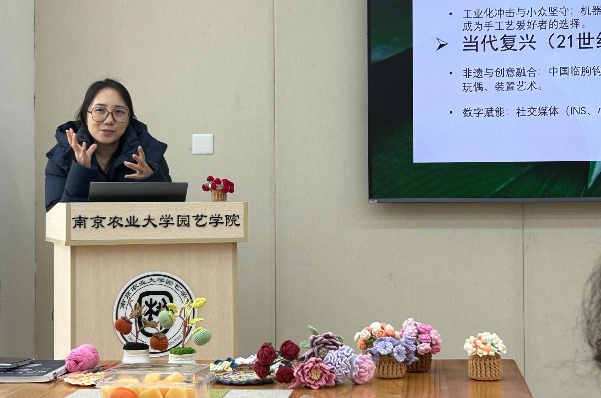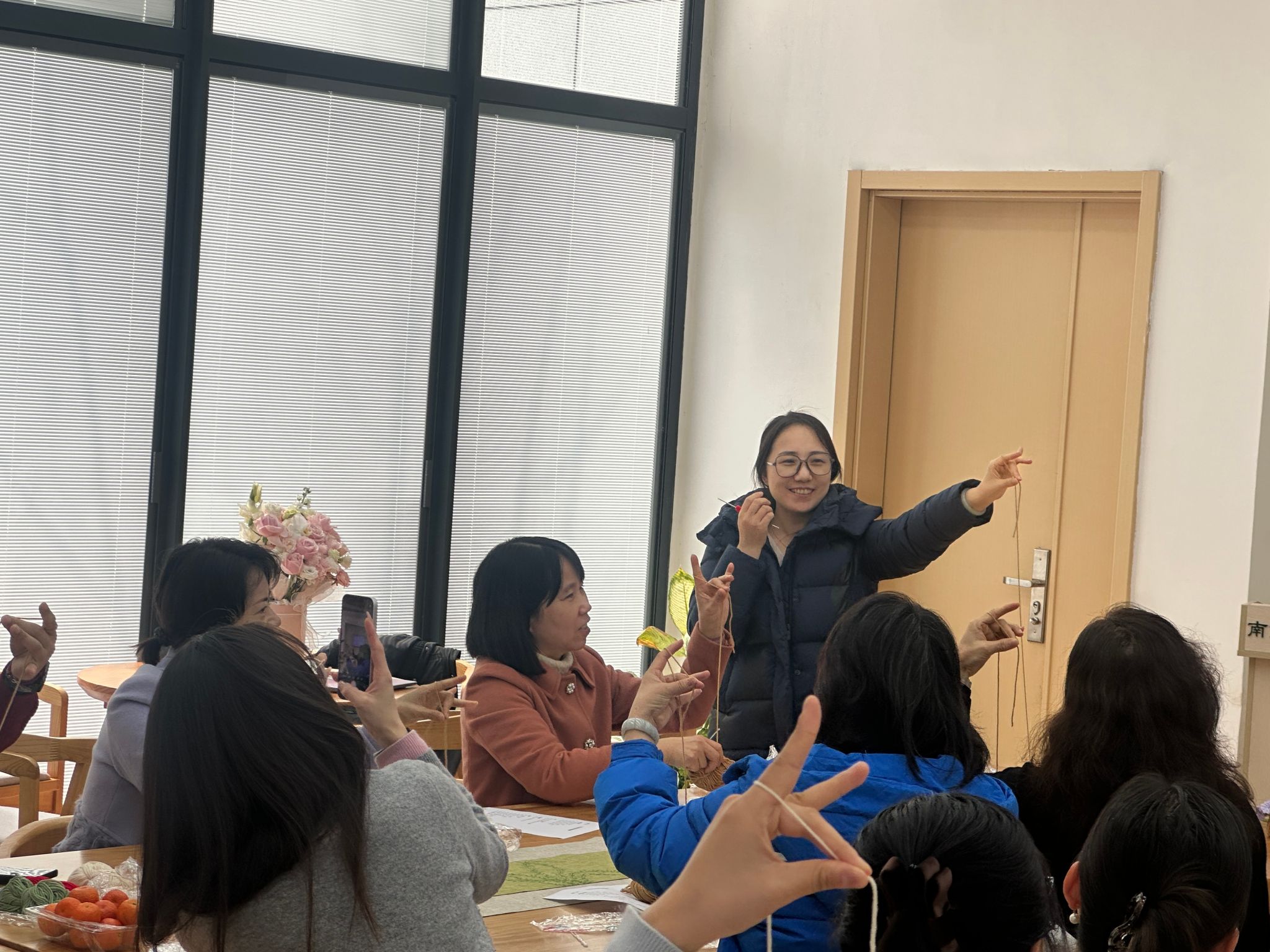 薛蕾老师作编织技艺讲授,薛老师从钩织起源、钩针型号、毛线材质特性讲起,逐步示范起针、锁针、短针等基础针法,手把手教学,针对老师们操作中遇到的难点问题,逐一进行指导,最终一朵朵活泼可爱的玫瑰花在老师们手中诞生。