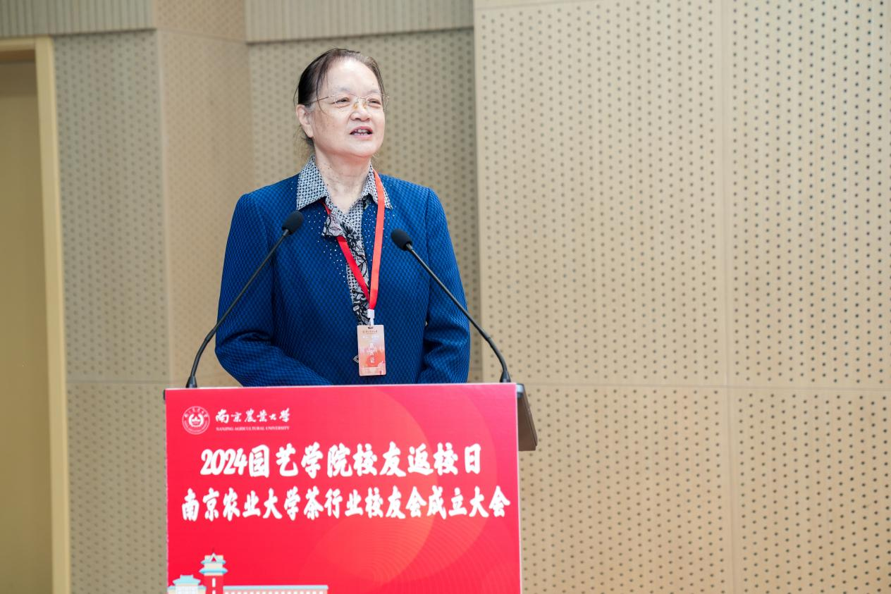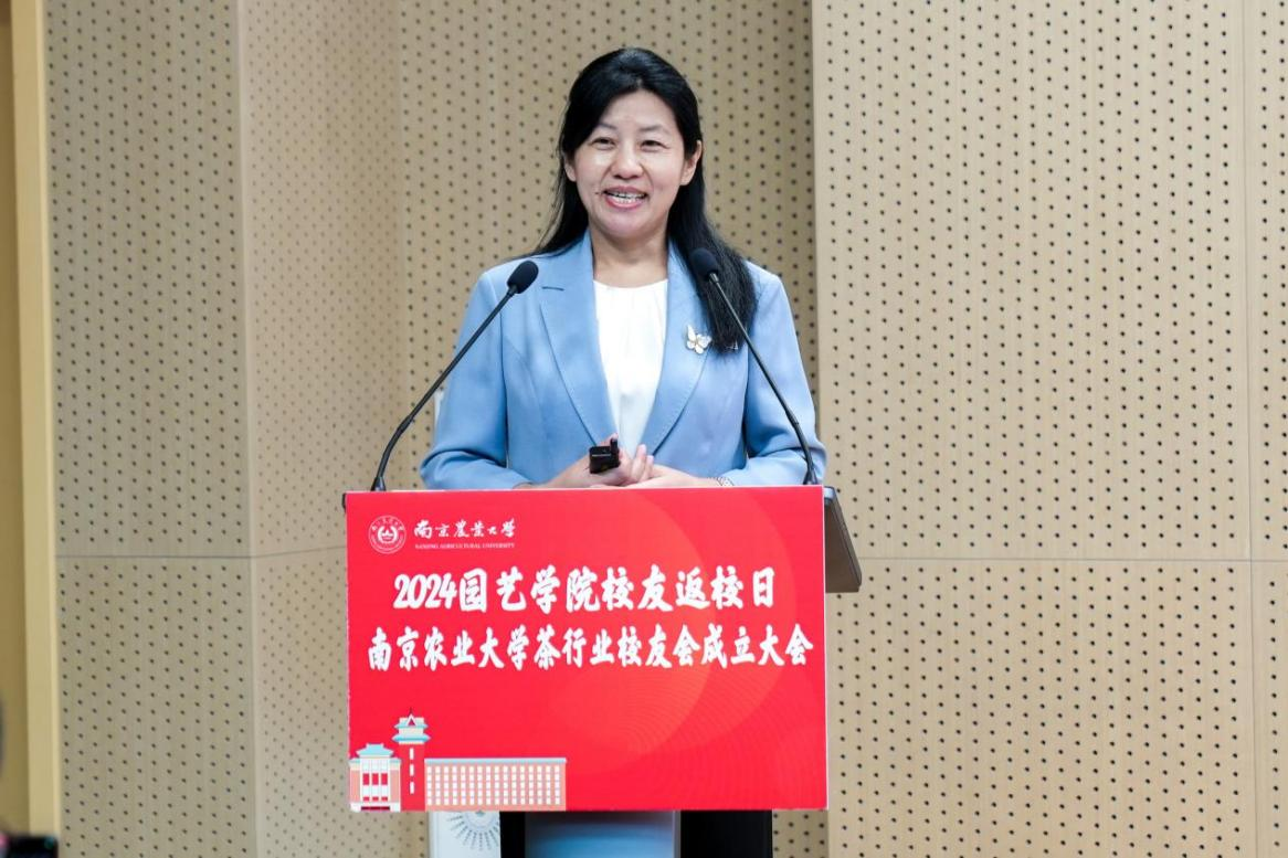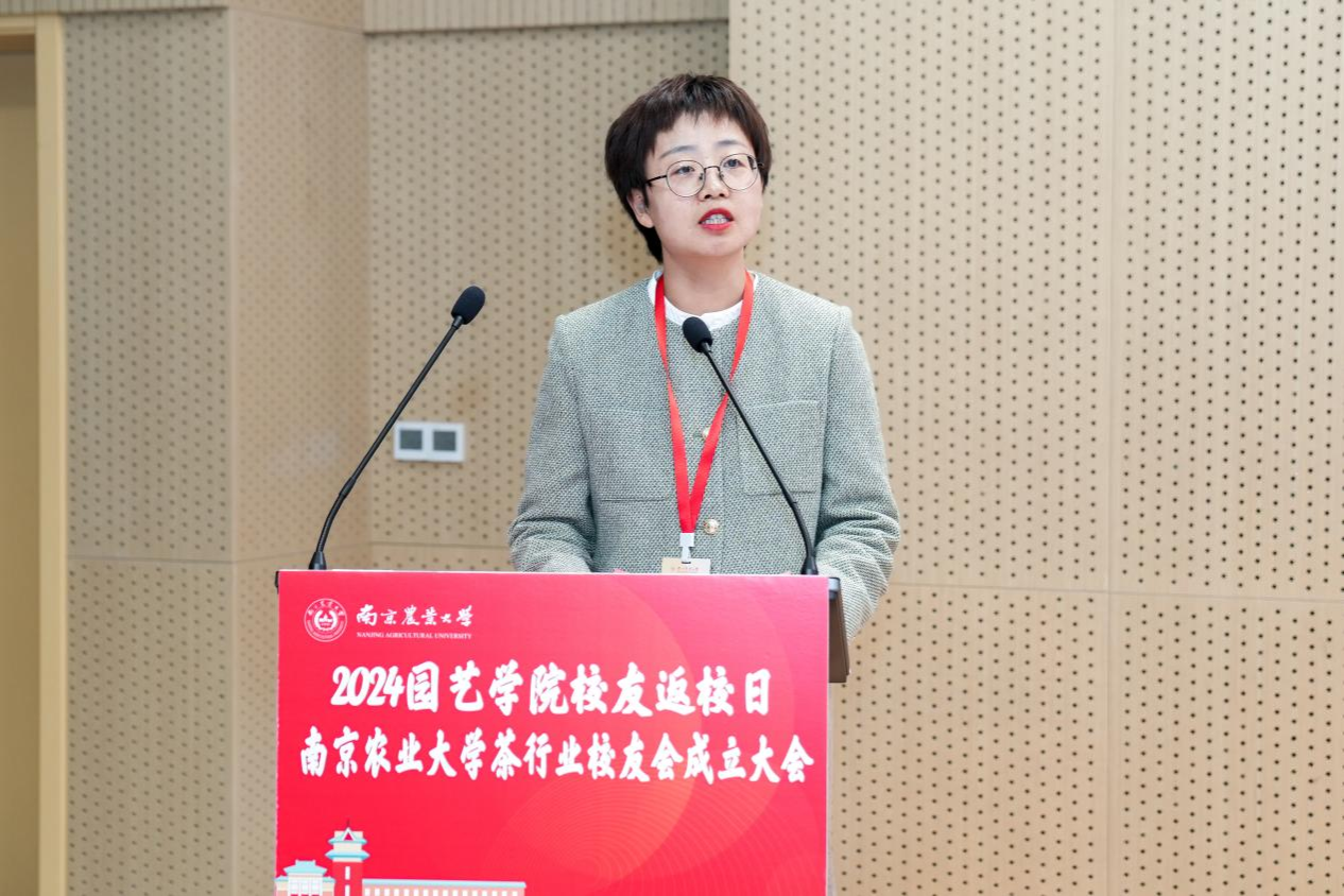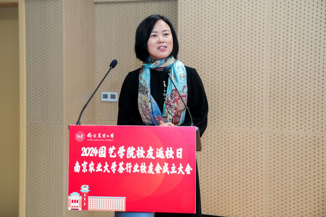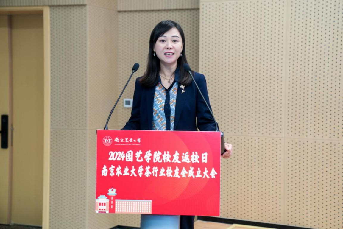 茶行业校友会顾问代表张定女士希望南京农大茶学学科既要能够发高质量的文章,更要把文章写在大地上、茶园里、茶场里,为茶叶行业的发展做出顶天立地的贡献。分会会长房婉萍在发言中表示,将带领分会成员继续发扬诚朴勤仁校训精神。校友代表上海六羡文化创意有限公司董事长冯卫英女士分享了自己的成长经历和对母校的深厚情谊。