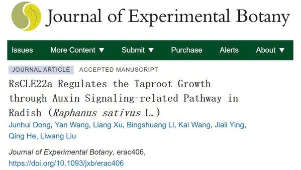 萝卜(Raphanus sativus L.)是一种重要的十字花科根菜类蔬菜作物,其肉质根由维管形成层不断分裂分化而来。维管形成层活性直接关系到萝卜肉质根形成膨大,影响其产量和商品价值。植物激素和信号肽在细胞间通讯、植物生长发育和环境响应中发挥着重要作用。CLAVATA3/EMBRYO SURROUNDING REGION-related(CLE)多肽分子广泛参与植物生长发育,但CLE肽在萝卜肉质根形成中的作用机制仍不明确。2022年10月14日,国际植物科学领域知名期刊Journal of Experimental Botany在线发表了六合彩网
