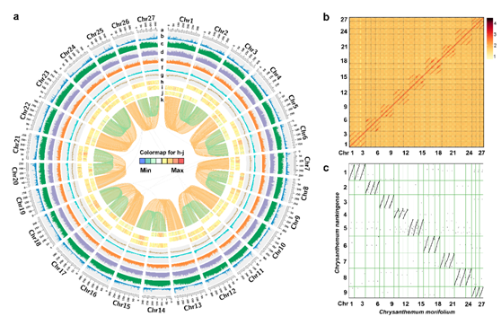 图1菊花基因组及其与菊花脑基因组的共线性