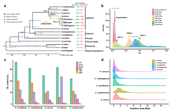 通过比较基因组学分析,发现菊科与伞形科在约92.4百万年前(Mya)分化,菊科中菊属与蒿属在约6.5Mya分化。利用高质量基因组,我们发现并明确了菊属植物共享的WGT事件(~6Mya),以及菊花特有的WGT事件(~ 3 Mya)和菊科共享的WGT事件(~ 57 Mya),表明菊花在核心真双子叶植物共享的WGT-γ事件(~122-164 Mya)后,又经历了3次WGT事件。而近期(<0.5Mya)LTR反转座子的爆发(占据近80%的基因组序列),最终塑造了菊花的大基因组(图2)。