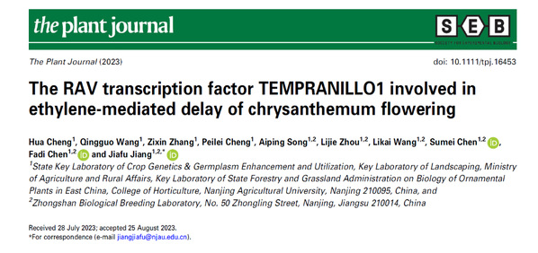 菊花遗传与种质创新团队的蒋甲福教授在国际知名期刊The Plant Journal发表了题为“The RAV transcription factor TEMPRANILLO1 involved in ethylene-mediated delay of Chrysanthemum flowering”的论文,揭示了菊花CmTEM1介导乙烯抑制菊花开花的分子调节机制。