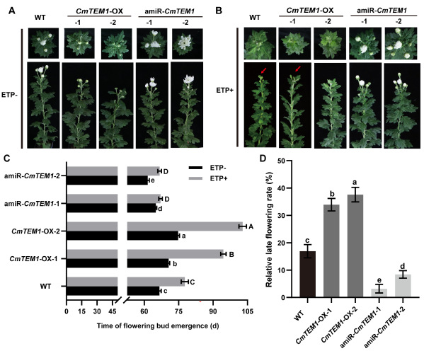 图1 乙烯处理野生型和CmTEM1转基因菊花的开花表型