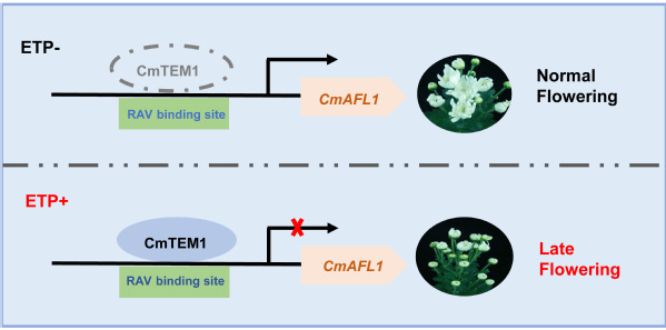 图3 CmTEM1-CmAFL1介导乙烯抑制菊花开花的工作模式图