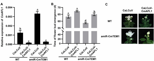 进一步对超表达株系CmTEM1-OX进行转录组测序分析,发现作为APETALA1(AP1)/FRUITFULL(FUL)亚家族成员的开花整合子CmAFL1的表达显著下调,RT-qPCR实验证实该基因在沉默株系amiR-CmTEM1中上调表达。分子生物学实验表明CmTEM1能直接结合CmAFL1的启动子并抑制其转录。为了进一步明确CmTEM1与CmAFL1之间的调控关系,利用甘蓝卷叶病毒沉默载体表达系统分别在WT和amiR-CmTEM1株系中沉默CmAFL1,表型观察发现CaLCuV-CmAFL1/ amiR-CmTEM1植株开花早于CaLCuV-CmAFL1/WT植株,但晚花于CaLCuV/WT植株(图2)。