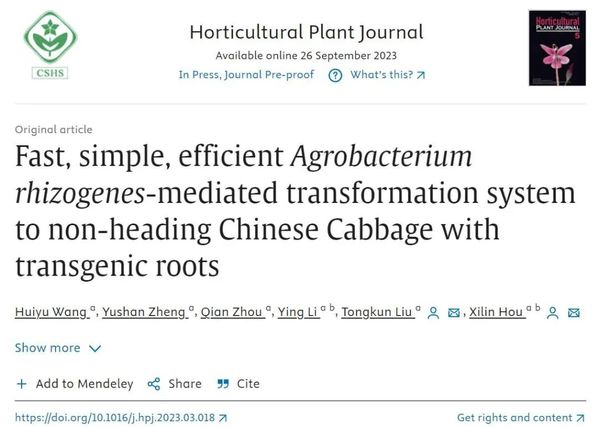 大学侯喜林团队题为“发根农杆菌介导的快速、简单、高效的不结球白菜转基因根系转化方法”的研究论文。