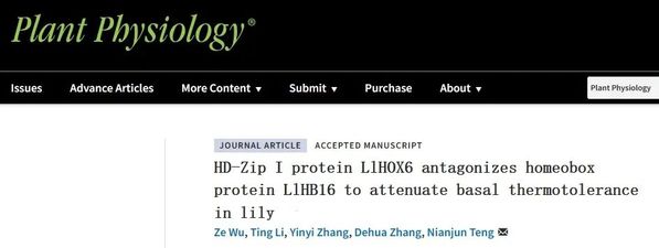 大学滕年军教授团队近年来在百合耐热性调控机制研究中取得了一系列研究进展,揭示了百合热激转录因子HSFA3通过高温诱导的可变剪接机制精细调控耐热性的机制(Wu et al., 2019, Plant Physiology; 与中国农业大学义鸣放教授合作完成);阐明了百合WRKY39以钙离子依赖的方式与CaM3互作精细调控桥接因子MBF1c的表达正向调控耐热性机制(Ding et al., 2021, Horticulture Research);发现了百合WRKY转录因子WRKY22直接作用于DREB2的上游参与耐热性的调控(Wu et al., 2022, Horticulture Research);在百合中鉴定了MYB305-C3H18-WRKY33功能模块调控耐热性(Wu et al., 2023, Molecular Horticulture);鉴定了一个膜结合的NAC转录因子LlNAC014,其响应高温转移至核内,激活DREB2-HSFA3模块正向调控耐热性(Wu et al., 2023, Journal of Experimental Botany);该篇论文进一步发现百合另一个HD-Zip I成员HOX6与HB16互作,拮抗地调控百合耐热性。基于上述系统的研究,该团队构建了比较完善的百合响应高温胁迫的分子调控网络,将为百合乃至其他农作物耐热性改良提供了重要理论基础。