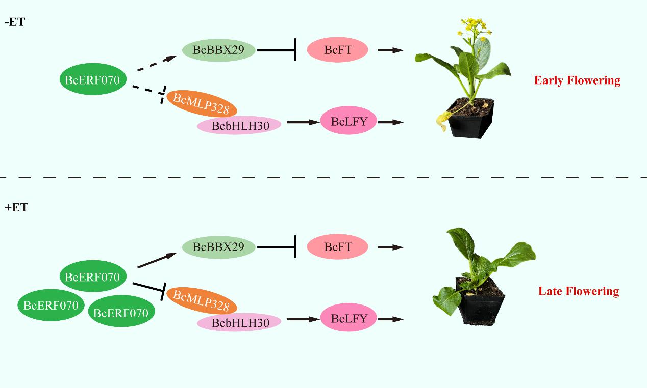 基于上述结果,提出了BcERF070响应乙烯抑制不结球白菜开花的工作模型(下图)。通常情况下,BcERF070的表达量较低,正常开花。然而,在乙烯诱导下,BcERF070的表达量显著升高。增多的BcERF070会损伤BcMLP328-BcbHLH30复合物对BcLFY的促进作用,从而导致不结球白菜开花延迟。与此同时,BcERF070还能直接促进开花抑制子BcBBX29的表达,从而降低不结球白菜中BcFT的表达,从而抑制开花。