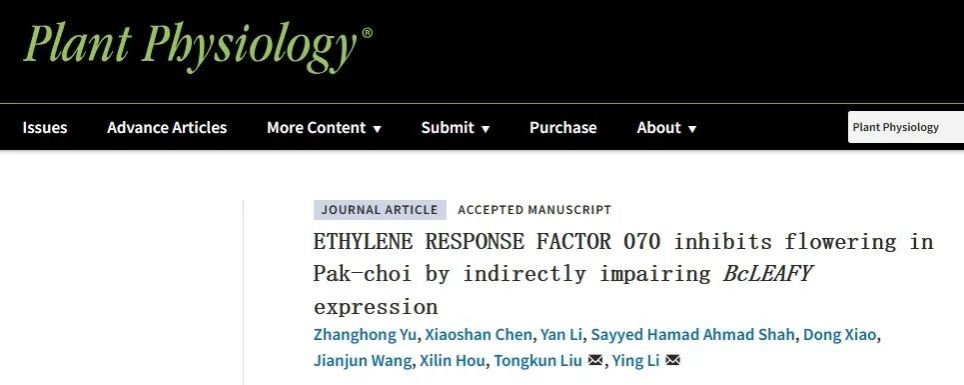 近日,六合彩网白菜系统生物学实验室在Plant Physiology杂志发表了题为“ETHYLENE RESPONSE FACTOR 070 inhibits flowering in Pak-choi by indirectly impairing BcLEAFY expression”的研究论文。该研究解析了乙烯响应因子BcERF070抑制不结球白菜开花的分子机制。