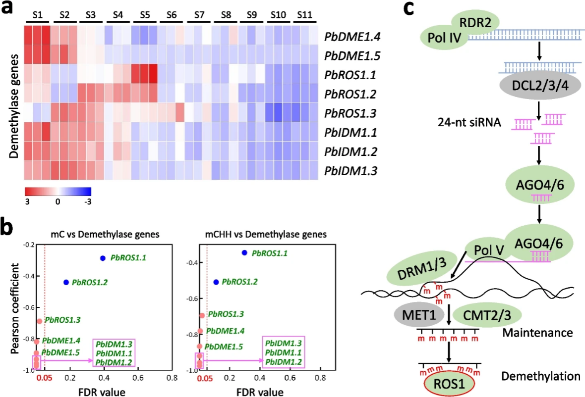 目前研究人员对作物果实发育调控已经进行了广泛研究,但多年生果树的代谢调控网络仍然知之甚少。梨(Pyrus bretschneideri)作为全球广泛种植的果树,其果肉发育过程中DNA甲基化的作用机制尚不完全明了。该研究通过对11个不同发育阶段(从幼果到成熟)梨果肉组织的代谢组、蛋白质组、转录组、DNA甲基组和小RNA进行了全面分析,探究了梨果实发育过程中代谢产物与DNA甲基化的关系。这项研究不仅填补了多年生果树代谢调控网络研究的空白,而且为提高梨果实品质提供了新的思路。