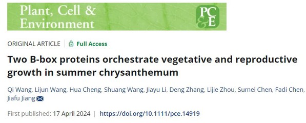 菊花遗传育种与种质创新团队蒋甲福教授在Plant Cell & Environment发表了题为“Two B-box proteins orchestrate vegetative and reproductive growth in summer chrysanthemum”的论文,揭示了B-box蛋白CmBBX5和CmBBX8协同参与调控夏菊营养生长和生殖生长的机制。