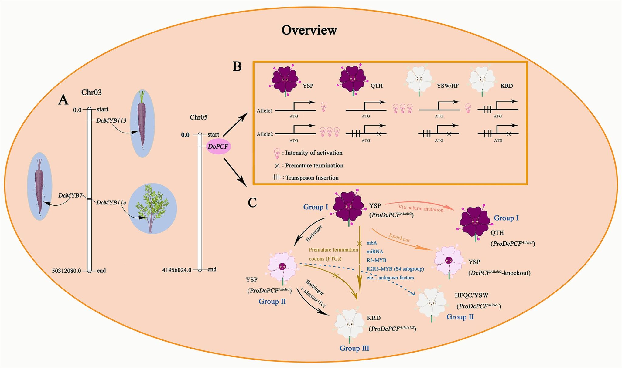 利用野生和栽培胡萝卜为试验材料,该研究鉴定到R2R3-MYB基因DcPCF是导致紫色中心花形成的候选基因,具有组织特异性,仅在紫色中心花中表达。该研究发现胡萝卜紫色中心花特征的丢失机理归纳为三个事件:启动子区域转座子的插入、编码序列的提前终止(由开放阅读框中的C-T替换引起),以及未知的花青素抑制子。这三个事件既可能是连续发生,也可能是独立发生。栽培型胡萝卜‘齐头黄’(‘QTH’)和野生型胡萝卜(‘YSP’)都具有紫色中心花,在‘QTH’的一条染色体上DcPCF存在编码序列的提前终止和转座子插入的现象。研究发现‘YSP’基因序列经过自然突变后转变为‘QTH’型,这一转变可能没有造成紫色中心花性状的丢失,这也反映了‘YSP’基因型可能是一种古老的基因型。第一个事件是由于Harbinger插入导致ProDcPCFAllele2-YSP序列类型变为ProDcPCFAllele1-YSP类型,导致中间小花由紫色特征变为粉色特征。这种粉色表型在自然界中并未发现,也尚未被研究人员报道。随后通过插入Mariner/Tc1转座子事件发生,产生ProDcPCFAllele1/2-KRD类型,将粉红色特征改变为白色特征,在这种情况下,该过程可以被认为是连续的。从‘YSP’紫色特征向‘KRD’非紫色特征进化的第二个事件是由于编码序列的提前终止,使基因失去调控能力。此外,还发现ProDcPCFAllele1-YSP、ProDcPCFAllele1-YSW和ProDcPCFAllele1-HFQC序列非常相似,但‘YSW’和‘HFQC’没有表现出粉红色特征。推测花中可能还有其它未知的抑制子,如m6A、miRNA、R3-MYB和S4-MYB等,这些被归为第三个事件。在具有非紫色中心花的材料中过量表达DcMYB7(调控紫色胡萝卜主根花青素积累关键因子)和DcMYB11c(调控胡萝卜紫色叶柄花青素积累的关键因子),转基因胡萝卜植株在花瓣上并未有紫色积累,而在子房和雄蕊上表现出紫色特征。同样,‘YSP’花在开放的早期,整个花盘呈粉色特征,中心小花在盛花期由粉色变成深紫色,而其它花则变成白色。这些发现表明,花中花青素合成相关的基因可能受到其它因素的抑制。