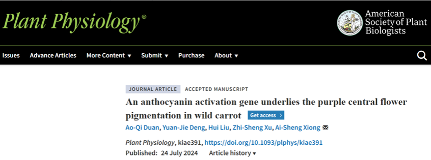 蔬菜学国家重点学科伞形科蔬菜团队在Plant Physiology杂志发表了题为“An anthocyanin activation gene underlies the purple central flower pigmentation in wild carrot”的研究论文,系统揭示胡萝卜伞形花序中心花从紫色到白色转变的分子基础。