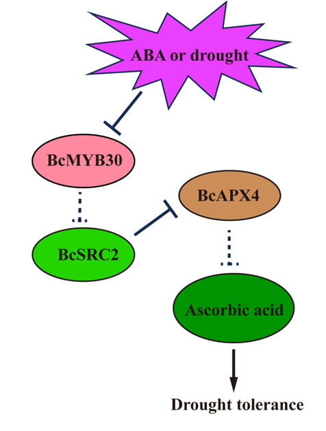 基于以上研究,提出了不结球白菜中抗坏血酸响应ABA信号和干旱胁迫的分子机制。当干旱和ABA来临时,BcMYB30受到抑制,对BcSRC2的转录抑制作用被打破。BcSRC2通过与BcAPX4互作,加强对APX酶活的抑制作用,抗坏血酸含量得到累积,进而抵御干旱胁迫。