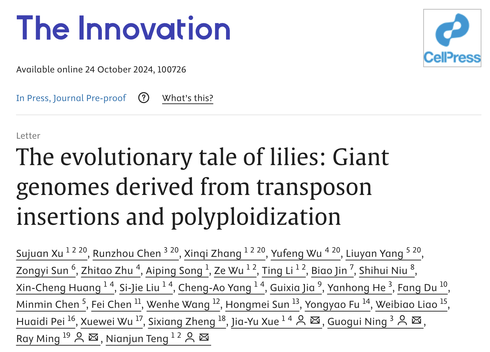 宁国贵教授团队与福建农林大学明瑞光教授团队等国内10多家科研团队联合公布了百合高质量染色体级别基因组,成为世界上首个正式报道的最大植物基因组。六合彩网相关的文章“The evolutionary tale of lilies: Giant genomes derived from transposon insertions and polyploidization”发表在《The Innovation》期刊。
