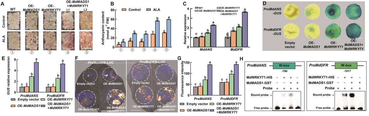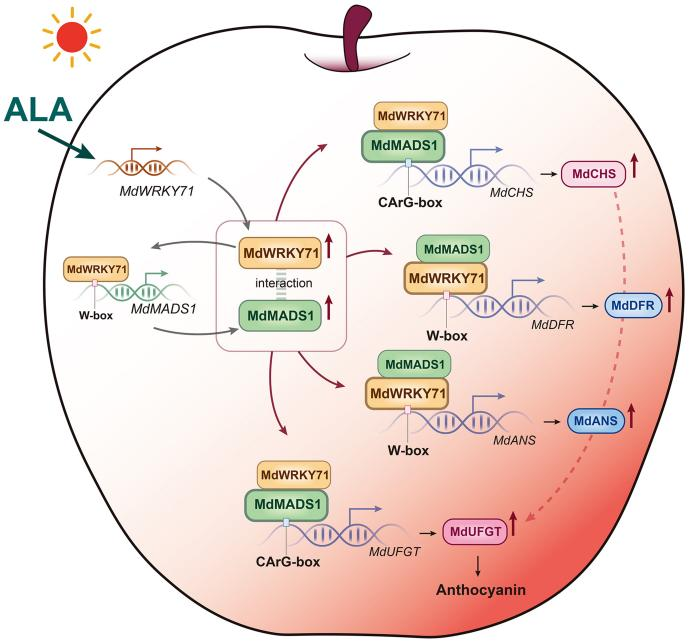 图片摘要 MdWRKY71-MdMADS1模块介导ALA诱导苹果花青苷生物合成的转录调控模式