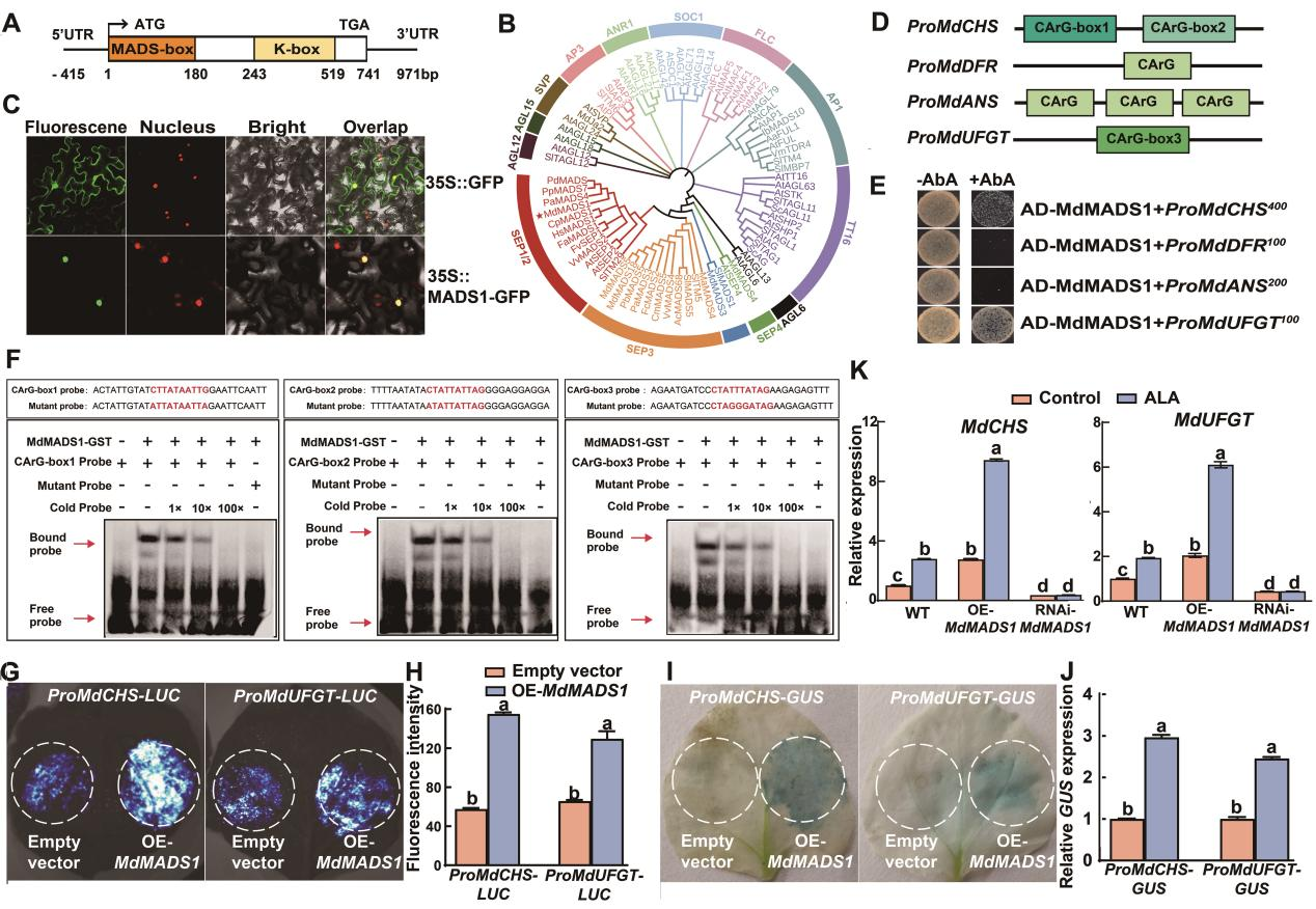 苹果是我国最重要的落叶果树,其果实芳香艳丽深受广大消费者喜爱。苹果的外观色泽是影响果实品质的重要因素,鲜红亮丽的果实更具市场竞争力,而果实红色主要由花青苷含量决定。5-氨基乙酰丙酸(ALA)是一种新型植物生长调节物质,具有显著促进苹果花青苷合成功能。该团队最先发现这一功能,并且获得农业农村部批准,使ALA成为我国第一拥有完全知识产权的苹果增色剂。经转录组和蛋白质组学分析,他们在ALA处理后的苹果果皮中鉴定到MADS-box转录因子MdMADS1,证明其参与ALA诱导花青苷积累,但其作用机制尚不清楚。本研究以ALA诱导MdMADS1基因表达为切入点,运用多种分子生物学手段,深入细致地解析了ALA诱导花青苷积累的转录调控机制。