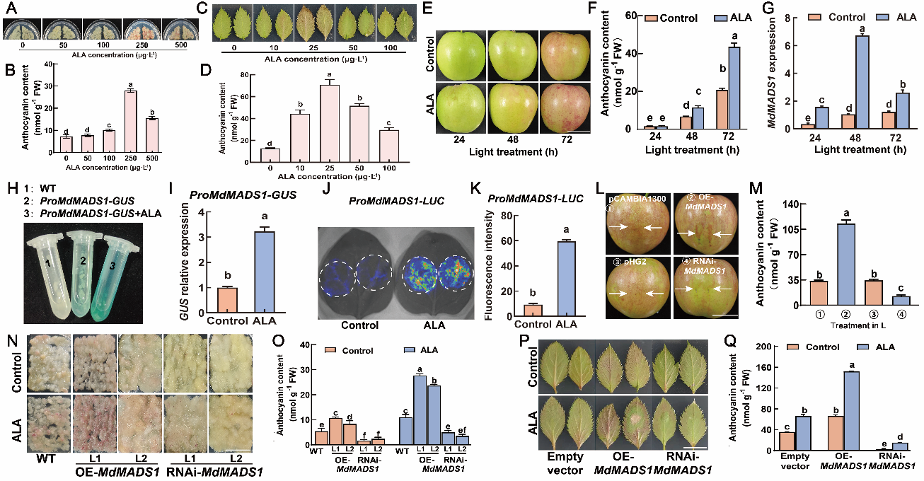 图1 MdMADS1参与ALA诱导的苹果花青苷合成