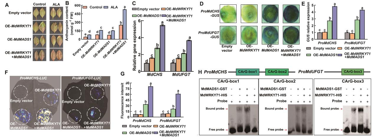 首先利用外源ALA处理、GUS、LUC报告基因、酵母单杂交、EMSA以及过表达和抑制表达体系证明,ALA诱导离体苹果果皮、叶片及愈伤组织花青苷合成过程中依赖于MdMADS1(图1),而MdMADS1作为转录因子能够结合并激活MdCHS及MdUFGT表达(图2),从而促进花青苷合成。